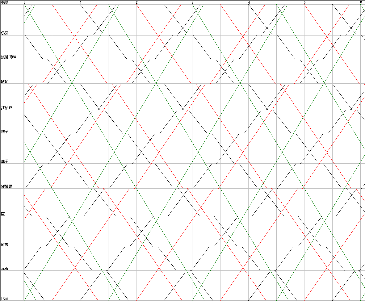 増発前のダイヤは通称”1号ダイヤ”と名付けられています。前回の記事でも説明しましたが、赤線の中間種別は新在直通新幹線を翡翠~雛罌粟間で併結するため、単線区間を走る新在直通新幹線の列車のダイヤが決まり、それ以外の列車が決まっていく感じでした。