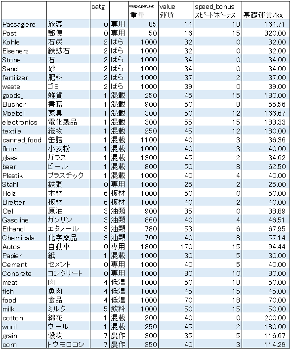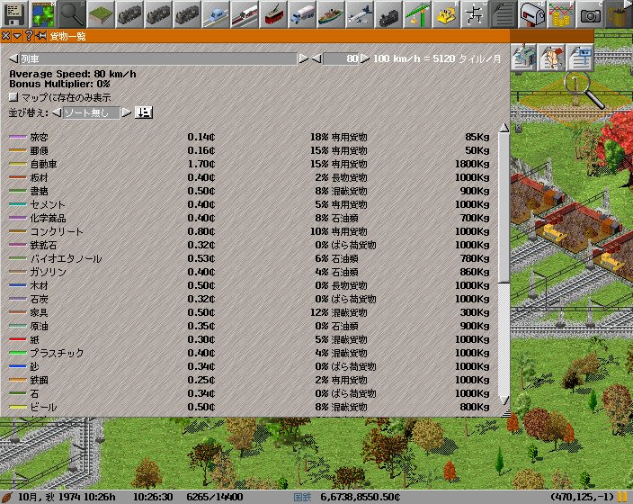 速度を60km/hに変えた場合、表の数値がこのように変わり、スピードボーナスが0の石炭は運賃が変わってないのに対して旅客は運賃が下がっているのがわかります。