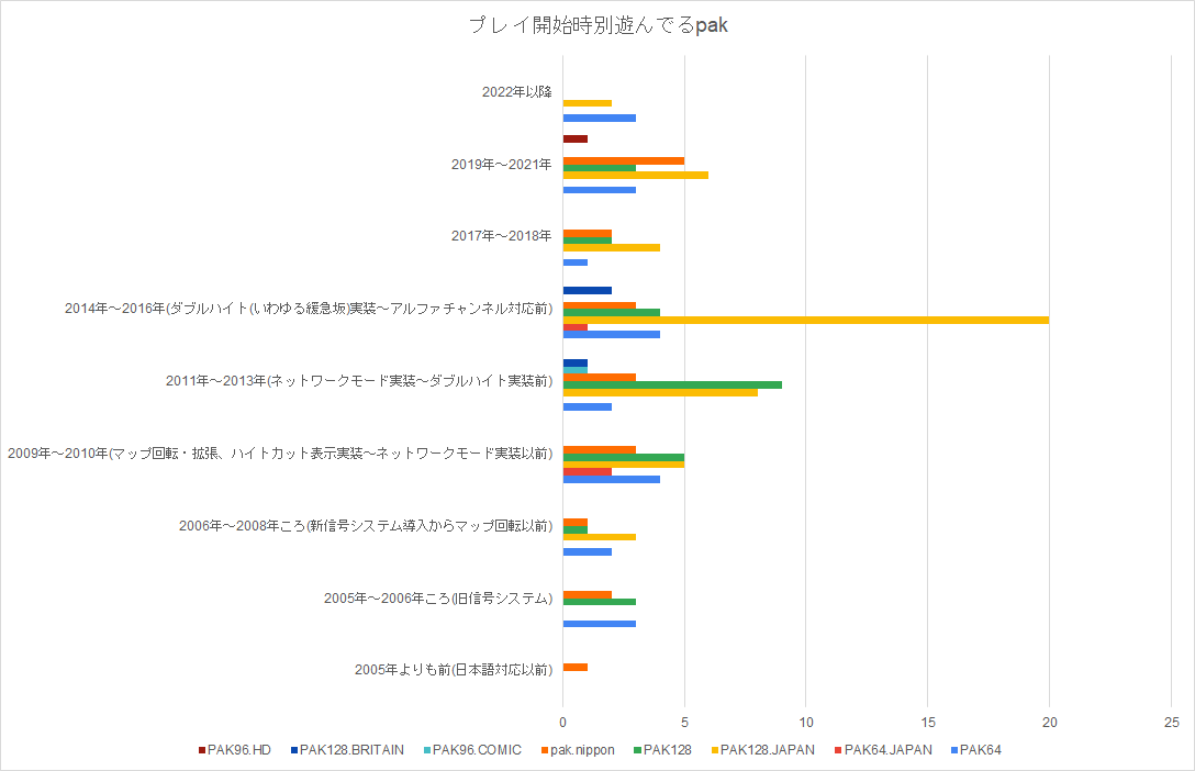 遊んだことのあるpakについては三大pakが均衡してる状態ですね。とりあえず三大pakで遊んでみてとかマルチプレイでやったことがあるなんて感じでしょうか。