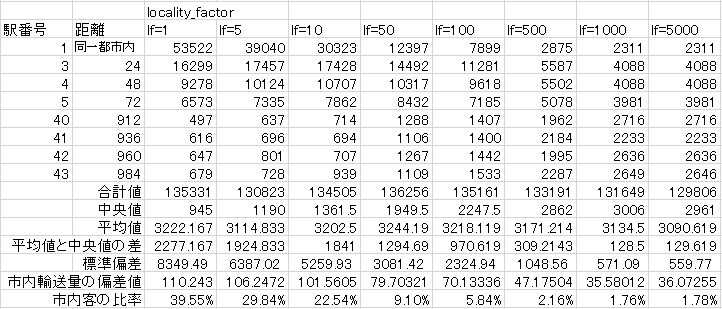 locality_factorが小さい(1桁くらい)と市内移動の客のほうが多いですが、50を超えてくると市内客よりも同レベルの旅客発生度でも別の都市に移動する客が多くなり、マップサイズの半分くらい(もしかしたら絶対値で500?)になってくると最も遠い都市と同じくらいの数しか旅客発生しないということがわかります。