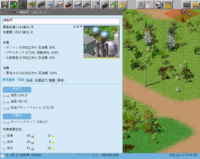 これはpak128の製油所のウインドウですが、上から最高生産(月間)1,194の能力があり、原油を150%消費したら80%のガソリン、100%のプラスチック、25%の化学薬品が製造されるということが書かれています。