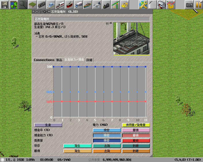 pak128の石炭発電は石炭を50%消費して電力を生み出します。また、旅客輸送で80%、郵便輸送で50%の増産が可能となります。電力を供給しても増産能力はありません。