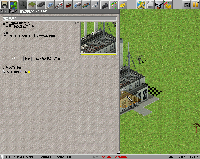 最高生産4960の石炭発電所です。これに十分な量の石炭を供給してその挙動を見ていきます。